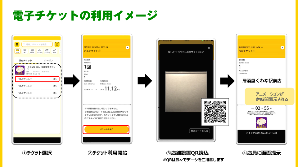 - お店に設置するQRコードを読み取って3分以内にお店のスタッフへ提示して利用します。